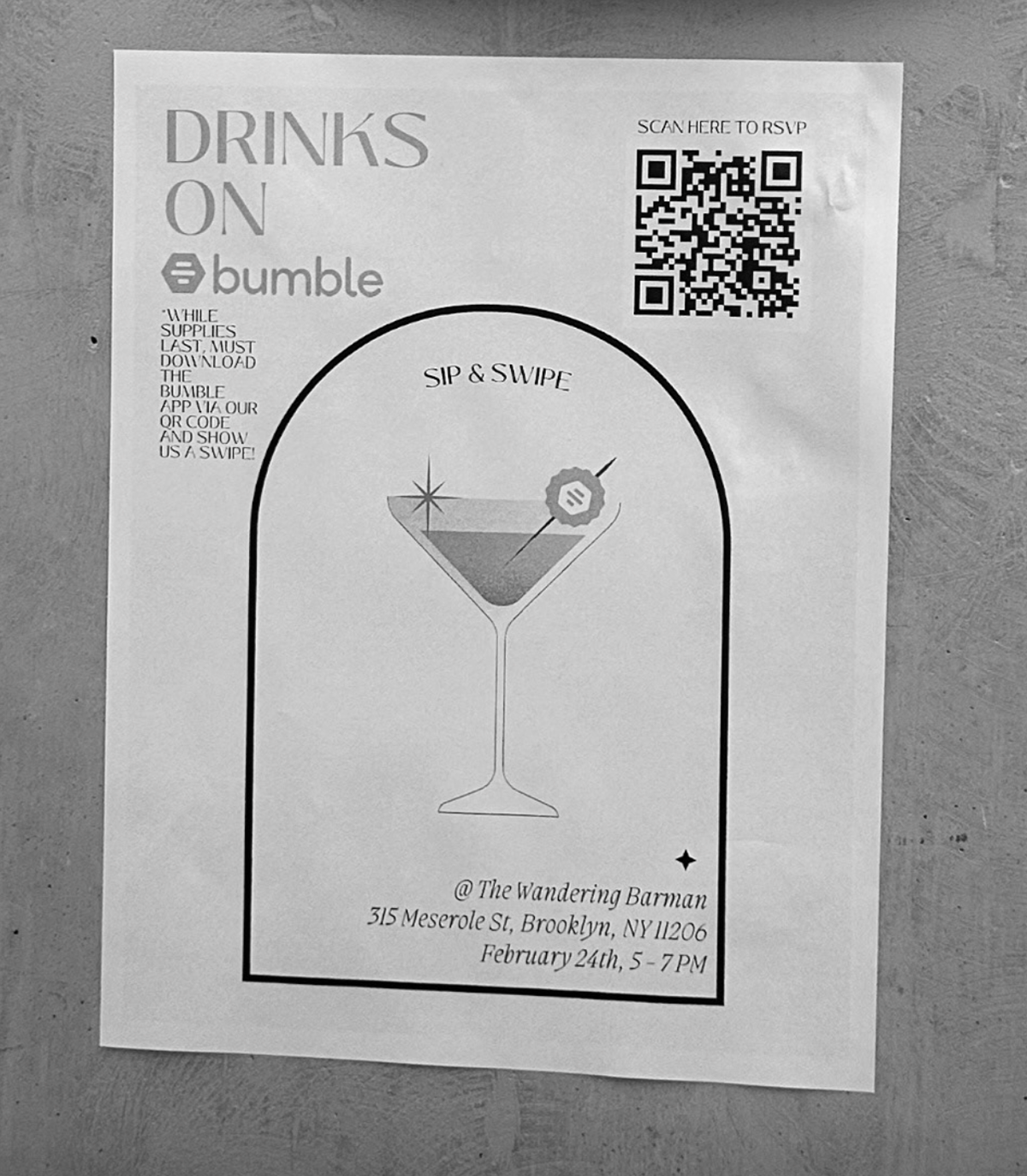 We hosted large-scale events for Bumble users and brand partners. Bar takeovers, launch parties, campus activations. My job was end-to-end: venue coordination, partner management, promotion, and running things on-site.